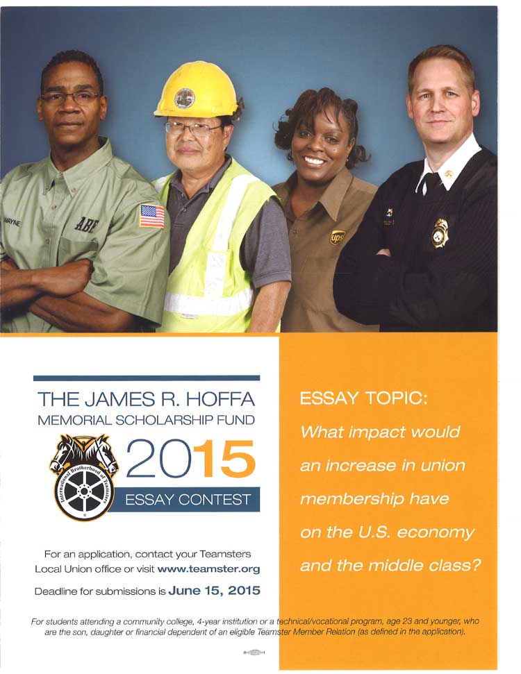 The James R. Hoffa Memorial Scholarship Fund has announced that this year’s topic for the Annual Essay Contest is “What impact would an increase in union membership have on the U.S. economy and the middle class?”