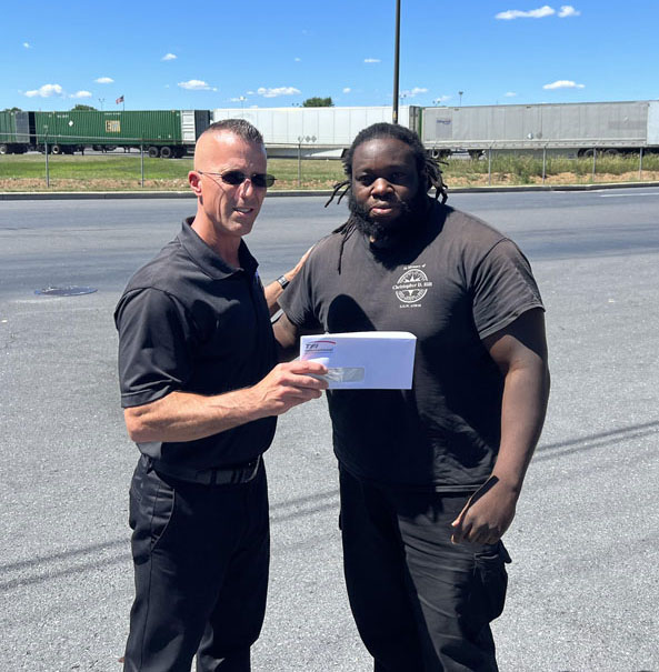 Local 776 BA Spencer Dearth (L) presents multiple checks to Local 776 Member Bernard Perry to cover all the hours he lost due to TForce Freight not recalling him to his part-time position.